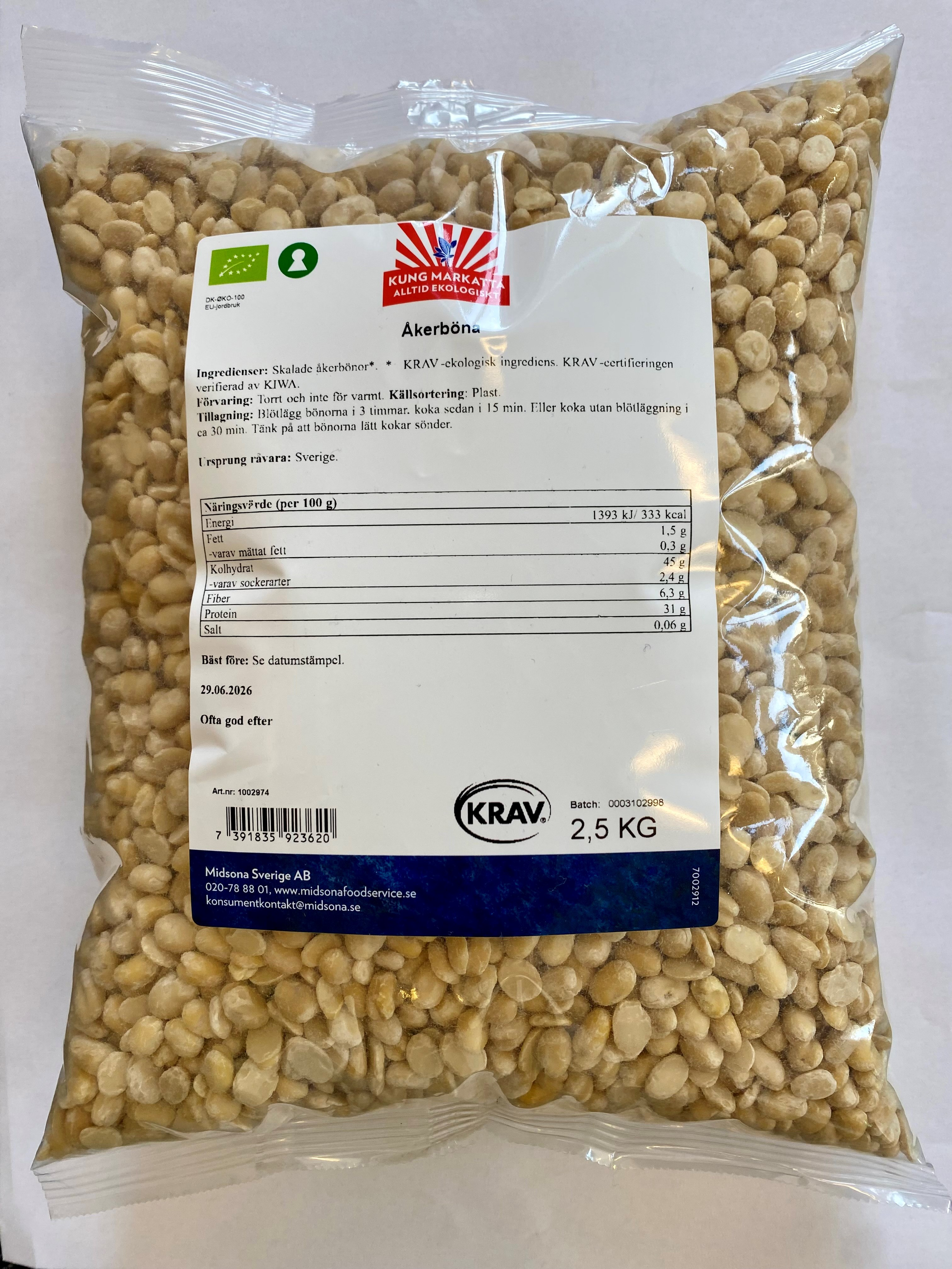 Kung Markattas ekologiska Åkerböna Svensk Skalad, ekologisk, KRAV-märkt och klimatkompenserad, Åkerbönor är en hjälte bland baljväxter. Bönan odlas främst för dess höga närings- och protein innehåll samt dess förmåga att klara av olika väder- och jordförhållanden. Smaken påminner om ärtor, har en lätt syrlighet och beska med blommiga toner.