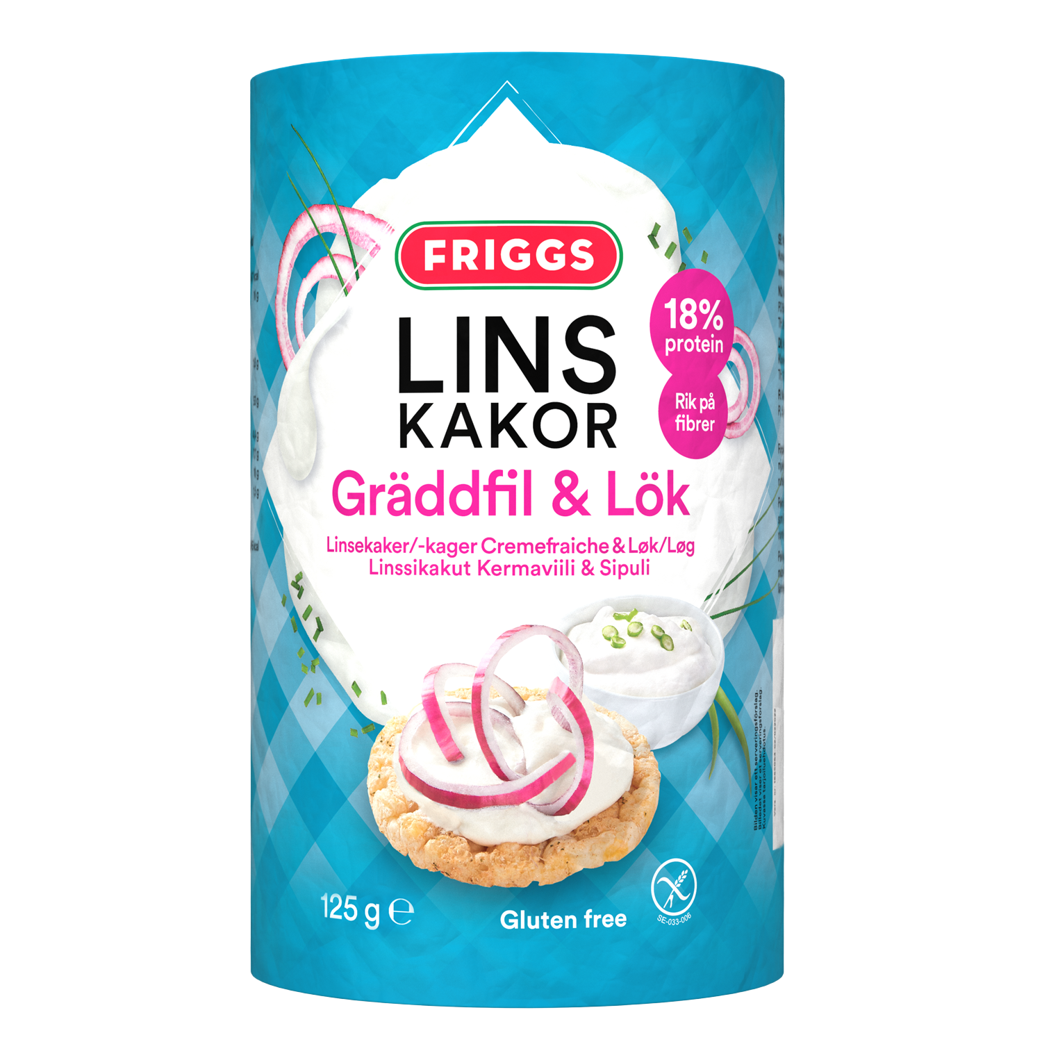 Ingredienser: Linsmjöl (47 %), majsmjöl, rapsolja, majs, kryddblandning med smak av gräddfil och lök 8,9 % (vasslepulver (från MJÖLK), salt, KÄRNMJÖLKSPULVER, ostpulver (OST, vasslepulver (från MJÖLK)), lökpulver 12 %, tomatpulver, dextros, vitlökspulver, arom, syra (äppelsyra), jästextrakt, persilja, surhetsreglerande medel (natriumdiacetat), cayennepeppar, färgämne (paprikaoleoresin)). Kan innehålla spår av soja och sesamfrö.